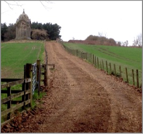 From the North, the mausoleum is 42 miles from Edinburgh on the A68. After passing through St. Boswells continue south for about two miles. As you climb a long hill, the Mausoleum will be visible on the skyline to the right. Continue a further half mile beyond the hilltop until you see the signs for Lilliardsedge Holiday Park on the right. There is a lay-by on the left just before the entrance. Park here and walk back up the road verge, past the houses, until you find a safe place to cross. Once across, continue up the hill to a gated farm track on your left going into the woodland. The mausoleum is a ten minute walk along the track. Private vehicles are prohibited along here, except on designated Open Days. See the News pages for further details.